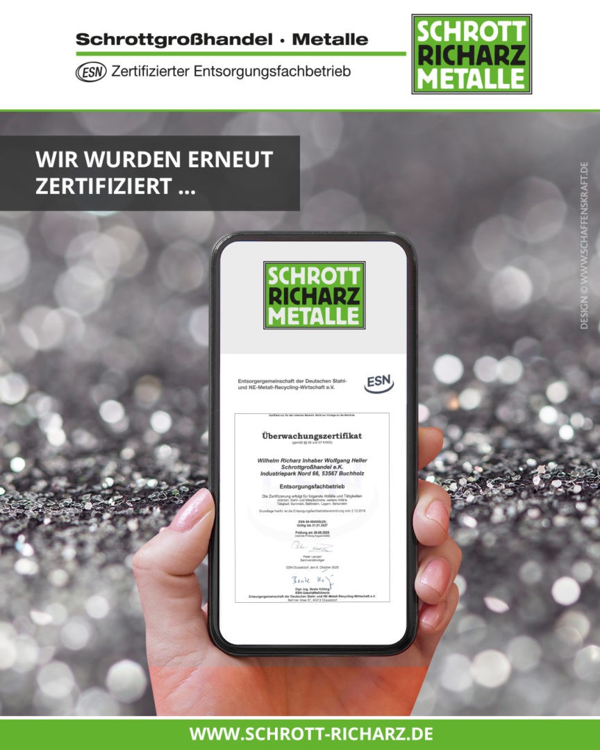 Unser Schrottgroßhandel ist erneut als Entsorgungsfachbetrieb für Stahl-/ Metallschrotte und weitere Abfälle zertifiziert worden.